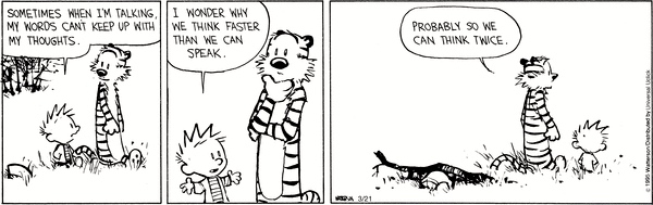 Well, a lot of those thoughts are plans (below the level of consciousness) for the production of speech, so of course they come first. But Calvin is talking about somewhat more conscious thinking, weighing choices about the content of what you’re going to say — in which case, thinking before you speak might be good advice.