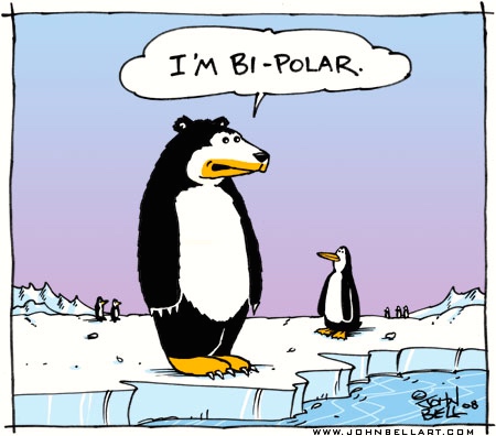 A pun on pole ‘extremity’ in either of two specialized uses: ‘extreme emotional state’ in bipolar ‘manic-depressive’ or ‘geographical extremity’ as in “North Pole and South Pole’. The bear in #3 hangs out at both geographical poles.