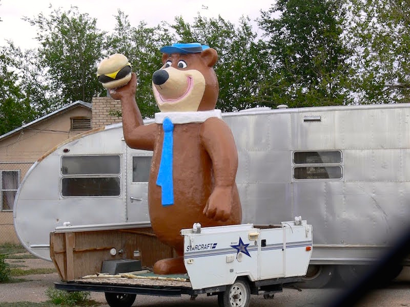 Now the Giants of Hatch. The figures — Yogi Bear, a big pink pig, two Muffler Men (one a soda jerk), Uncle Sam, a giant chicken, Robin Hood, a dinosaur, A&W Root Beer girl, a large hot dog advertising Sparky’s Green Chili Cheeseburger, a large red chili pepper, Mighty Mouse, Ronald McDonald, George Jetson, Robin Hood, and more, making a public festival of pop and commercial culture — are sort of sprinkled around Sparky’s Burgers, Barbecue, and Espresso at 115 Franklin St. in Hatch.