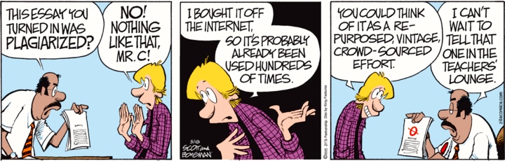 Has Jeremy been involved in “the practice of taking someone else’s work or ideas and passing them off as one’s own” (NOAD2)? Well, he’s certainly passed off as his own work something that was not. His defense appears to be that there is no person whose work this was; he wasn’t stealing from anyone. A bold move, but one that’s not flying with his teacher.