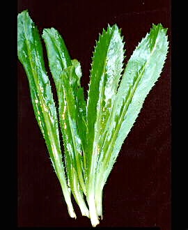 Eryngium foetidum is a tropical perennial and annual herb in the family Apiaceae. Its scientific Latin name literally translates as “foul-smelling thistle”. Common names include culantro …, Mexican coriander and long coriander [and sawtooth herb]. It is native to Mexico and South America, but is cultivated worldwide. In the United States, where it is not well known outside Latino and Caribbean communities, the name culantro sometimes causes confusion with Coriandrum sativum (also in Apiaceae), the leaves of which are known as cilantro, and of which culantro is said to taste like a stronger version.