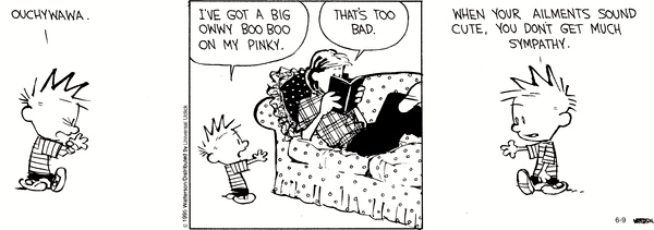 We have a problem in style and register here. The vocabulary Calvin has for talking about what afflicts him comes from a kind of babytalk — owwy ‘painful’, boo boo ‘small injury’ — so doesn’t get taken seriously. (But note that Calvin’s internal monologue, like his talk to Hobbes on other occasions, is decidedly adult: ailments, sympathy.)