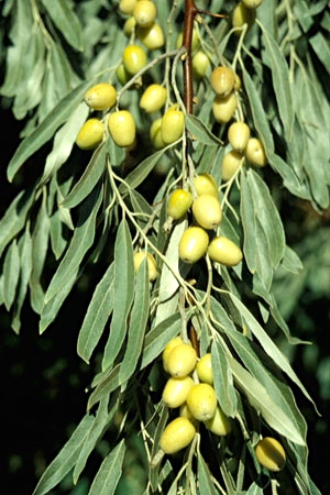 Elaeagnus angustifolia, commonly called silver berry, oleaster, Persian olive, or wild olive, or commonly referred to as Senjid or Sinjid in Afghanistan and Senjed in Iran, is a species of Elaeagnus, native to western and central Asia, Afghanistan, from southern Russia and Kazakhstan to Turkey and Iran. It is now also widely established in North America as an introduced species [and treated as invasive in some places; the seeds are spread widely by birds].