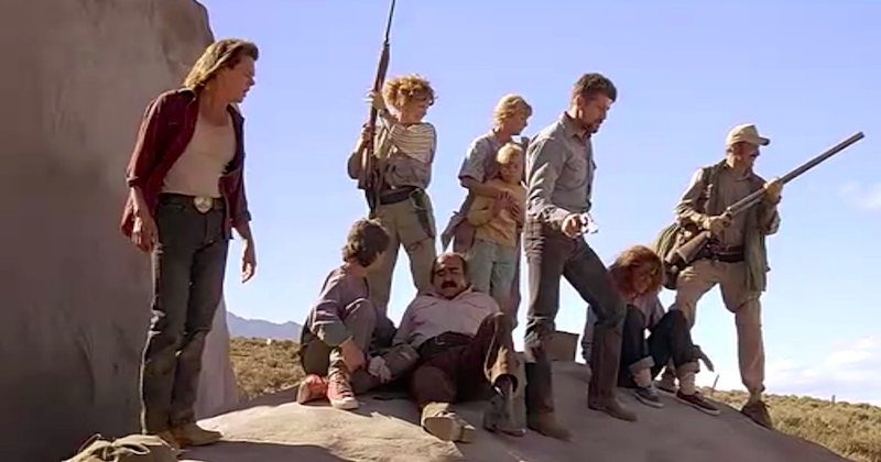 The principals hiding on a rock from the graboids. Kevin Bacon on the far left, Michael Gross wielding a weapon on the far right (and Reba McEntire, playing Gross’s wife, wielding the other weapon).