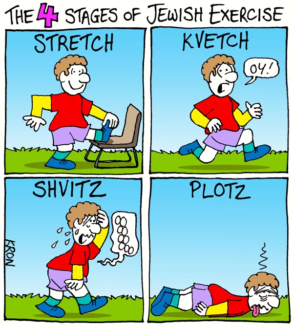 The verbs in panels 2-4 — kvetch ‘complain’, schvitz ‘sweat’, plotz ‘collapse (or be beside oneself with frustration, annoyance, or other strong emotion)’ — are all from Yiddish, taken into informal English. NOAD2 treats them all as North American and dates them to the 1960s; I’m not sure whether either of these judgments is accurate. But note that Kron is Australian; he’s been a cartoonist for the Australian Jewish News since 1993.