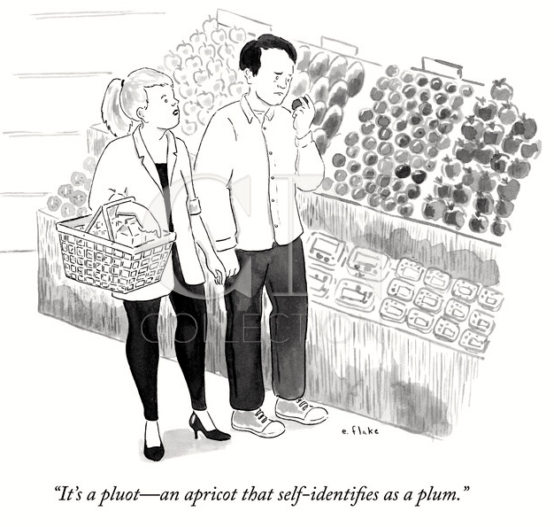 There reference here is to people with transgender self-identification, though in fact pluots are biological hybrids, parallel to intersex people. There might also be an allusion to white people who self-identify as black (posting on this blog here).