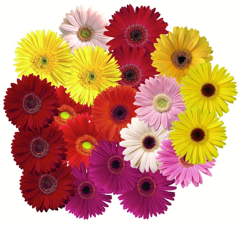 A gift from a friend a few days ago: a gorgeous, showy Gerbera plant, in bloom. An assortment of hybrid Gerbera flowers: