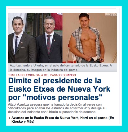 In a comment on my posting about the Basque language and the Basques in the U.S., someone using the name “Dirty Harri” (it’s a joke, as you’ll see, a play on the title Dirty Harry) picks up a news story about disagreements in 2013 between Aitzol Azurtza, the president of the New York Basque Club, and the visiting Iñigo Urkullu, the president of the Basque Government. During this contretemps, it was revealed (by others) that Azurtza had had a career in gay porn, under the stage name Antton Harri; Azurtza had come out some time before, but it was not generally known in the Basque world (in NYC or elsewhere) that he was a gay pornstar (of some repute), or indeed that he’d worked as a rentboy in NYC. Under the cloud of the porn revelations, Azurtza resigned his Basque Club position “for personal reasons” and not long after moved from New York to Palm Springs CA, where he lives now. A piece of reporting from the time: