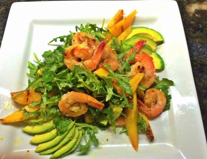Shrimp, mango slices, avocado slices, arugula, vinaigrette with cilantro.