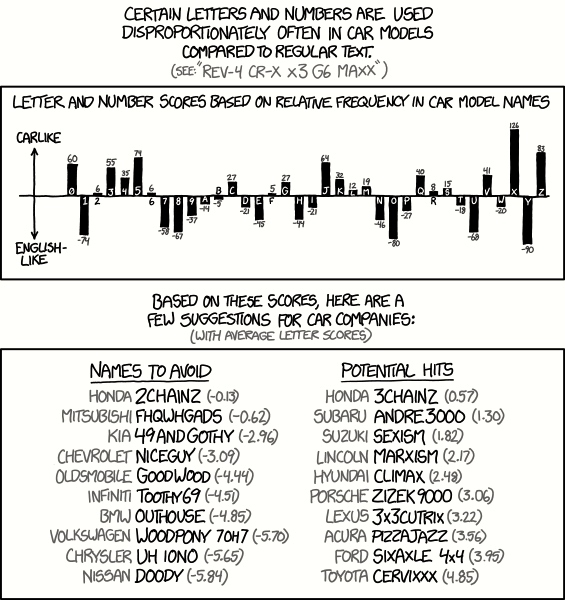 Car Model Names. As Explain xkcd tells us, the formula seems to depend on letter frequencies (in car names vs. ordinary English text), but the model names also involve great dollops of cultural knowledge of various kinds (as with 2CHAINZ and ZIZEK). CERVIXXX gets a high score because of those Xs (and probably the V), and then there’s a double dose of sex (in CERVIX, Latin ‘neck”, but specialized as an anatomical term for a part of the uterus; and then in XXX as well).