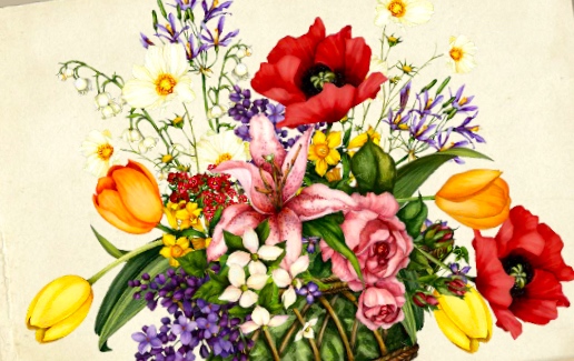 poppy (Papaver), rose (Rosa), yellow tulip (Tulipa), dogwood (Cornus), lily-of-the-valley (Convallaria), allium (Allium), cosmos (Cosmos), lilac (Syringa), lily (Lilium), pimpernel (Anagallis), jasmine (Jasminum), violet (Viola)