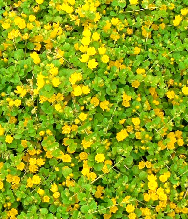 Genera in the family, beyond Anagallis, include two I’ve posted on before (with photos): the type genus Primula, of primroses (aka cowslips) — Primula vulgaris and gorgeous hybrid primroses, on 4/21/13 — and the genus Cyclamen, of equally gorgeous cyclemens, on 3/12/13. And then there’s the genus Lysimachia, with (among many other species) the groundcover L. nummularia (yellow loosestrife, creeping Jenny, or moneywort):