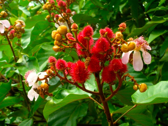 Achiote (Bixa orellana) is a shrub or small tree [in the family Bixaceae] originating from the tropical region of the Americas. Central and South American natives originally used the seeds to make red body paint and lipstick. For this reason, the achiote is sometimes called the lipstick tree.