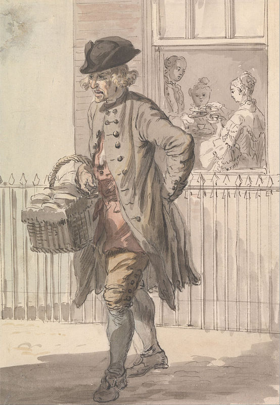 Modern depictions nearly always have American-style muffins (as in #2), which are known in the UK as well as the US, but early British depictions were of course of the breadstuff, as in this etching London Cries: A Muffin Man by Paul Sandby (c. 1759):