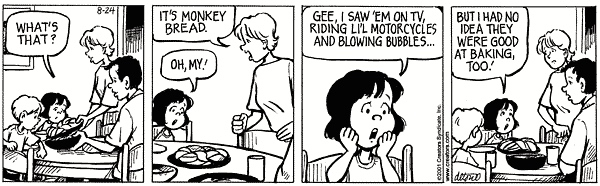 Ruthie is assuming that the semantic relationship between the head (N2) and the modifier (N1) is one from a relatively small set of standard relationships that you can use to create and understand novel combinations. One of these is physical resemblance: monkey bread could be bread made in the shape of a monkey — but Ruthie has only to look at the stuff to see that that’s not so. Another is source, or material of composition: monkey bread could be bread made from, or of, monkeys; I assume that Ruthie finds that too disgusting to contemplate. Instead, she opts for creator, or agent, as the role of monkeys in monkey bread: monkeys make the stuff, by baking.