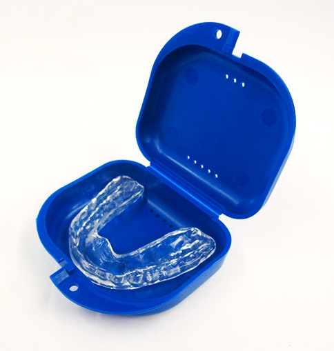Lots of possible contributory causes have been suggested, but none lead to especially effective prevention or treatment regimens. But damage to the teeth can be largely averted by the use of a protective device designed to fit the individual user: what’s known as a (dental) mouth guard (or mouthguard). One illustrated here, with its storage case: