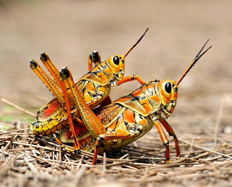 We get the Eastern lubber here [in South Florida]. Yes, very pretty. The young are black with red stripes along the body, and they hatch by the thousands. They are extremely destructive, and no insecticides kill the adults; you have to squish them, which is really disgusting.