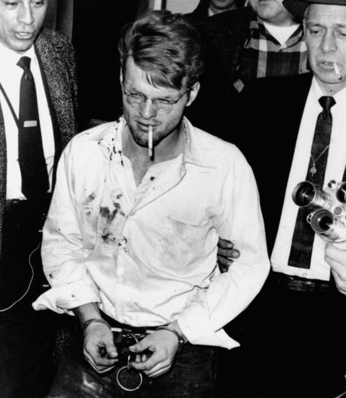 A cigarette dangles from the mouth of handcuffed killer Charles Starkweather as he is led into the Nebraska penitentiary by Sheriff Merle Karnopp, right, of Lincoln on February 1, 1958. Bloodstains on the shirt are from minor wounds suffered during his Wyoming capture.