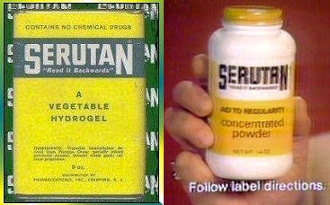 Serutan was an early fiber-type laxative [psyllium] product which was widely promoted on U.S. radio and television from the 1930s through the 1960s. It was manufactured by the J. B. Williams Co., which was founded in 1885 and bought out by Nabisco in 1971.