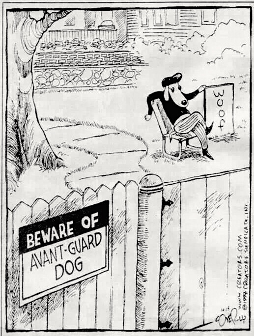 Coverly. Cartoon #1 has a POP (phrasal overlap portmanteau), but one that works only in pronunciation (not in print): avant-garde + guard dog, referring to what is in this case an avant-garde guard dog.