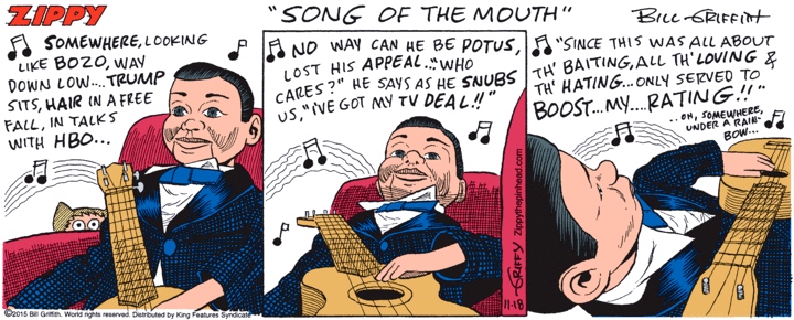 Today’s Zippy, with another song burlesque from the ventriloquist’s dummy, last heard from singing “The House of the Writhing Pun”: