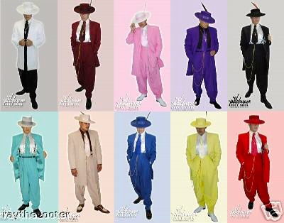A zoot suit … is a men’s suit with high-waisted, wide-legged, tight-cuffed, pegged trousers, and a long coat with wide lapels and wide padded shoulders. This style of clothing became popular among the African American, Chicano, Filipino American, and Italian American communities during the 1940s.