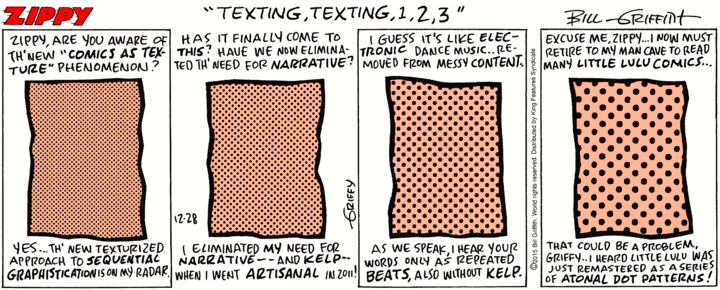 A Zippy, with Zippy in an exchange with Griffy on conventions of cartooning (with some mock academic art talk):