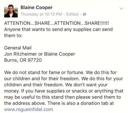 On to the Send Snacks theme. This starts with a 12/31 posting on Bundy Gangster Blaine Cooper’s Facebook page: