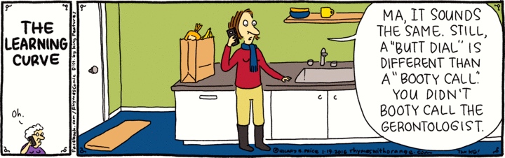 So far this has been about the verb to butt dial, but the cartoon uses the nouning a butt dial. Nouning of the verb dial is certainly possible — Here’s the number; give it a dial — but it is rare enough that NOAD2 doesn’t list a ‘phone call’ sense for the noun dial. However, once again things are different in the world of mobile/cell phones, where the nouning a butt dial is very common indeed. From just one Gizmodo piece (7/23/15 by Kalia Hale-Stern), we have the title: