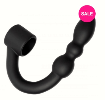 The first toy is named the Ass-X Ass-Lock. It’s a cock-and-balls ring combined with a buttplug (the name focuses on the anal half of the combo). $49.
