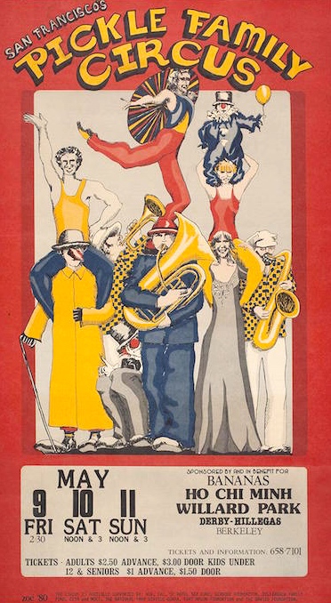 After working with the San Francisco Mime Troupe, the Pickle Family Jugglers (founded by Peggy Snider, Larry Pisoni, and Cecil MacKinnon) decided to create the Pickle Family Circus. Their first show was in May 1975, in the gymnasium of John O’Connell School in San Francisco. After they received a grant from the National Endowment for the Arts in 1976, they went on their first tour, going to five cities in Northern California. During the late 1970s and early 1980s, the Circus performed on weekends in the San Francisco Bay area during Spring and Fall, and toured for 3 months in the summer, mostly in towns along Highway 101 in Northern California and Oregon. In these years, the Pickles operated with a business model that every show was a benefit, usually for a local community organization. The local sponsor sold advance tickets (getting a portion of the revenue), did publicity and site preparation, and ran a midway. The Circus returned to the same towns year after year, and these events became an important source of funding for the sponsors.