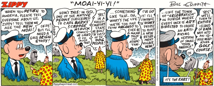 One more Zippy strip in the Easter Island series I posted about yesterday, now with an origin story for the Dog People of Easter Island and a proposal to make money by developing the site commercially: