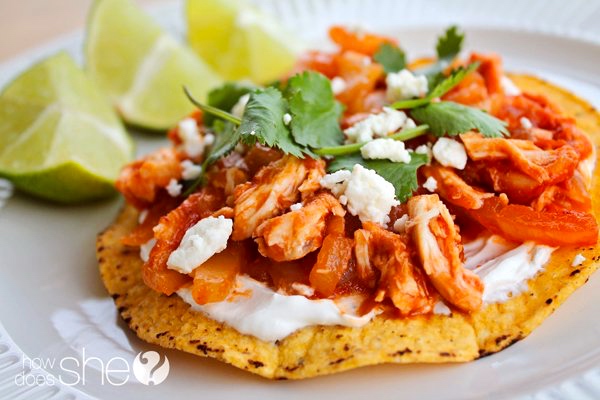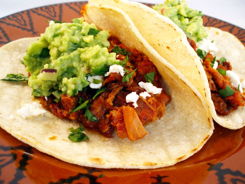 It is often garnished with guacamole or avocado slices and with greens, and served on tostadas or in tacos, as here: