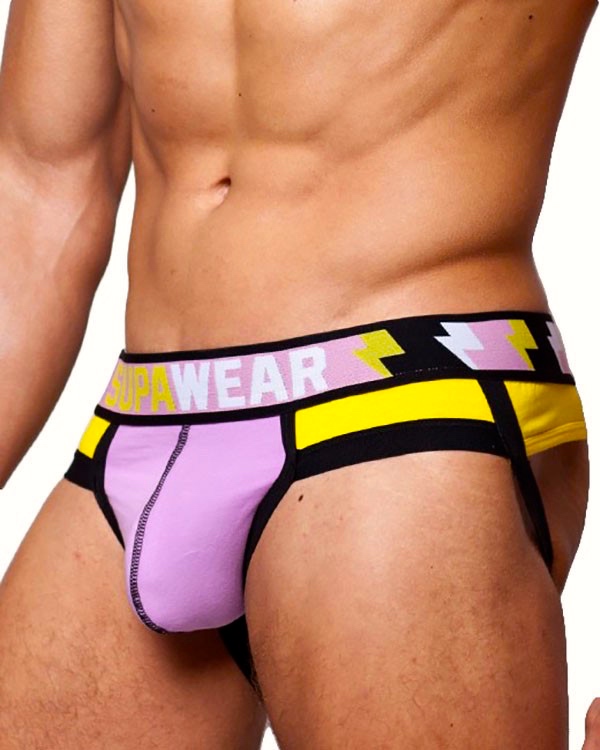 The most recent Daily Jocks ad, showing a model wearing a Supawear jock in the Supacharge line, with Lightning theme (there’s also a Thunder theme, but Lightning has the more startling colors):