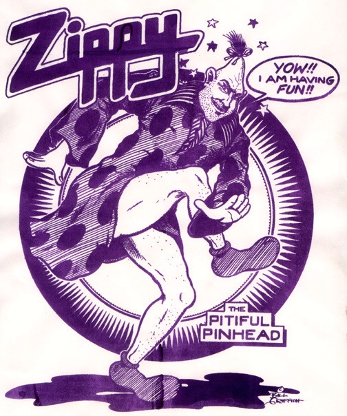 I did the first Zippy strip in 1971. A few years later, he took over as my main character. But in those early Underground days, Zippy was appreciably more wild & crazy. He hadn’t met Griffy yet, so his non sequiturs were totally untethered. Insanity reigned. Satire took a back seat. His head was pointier. Here he is in 1973, in his first t-shirt design. Enjoy.