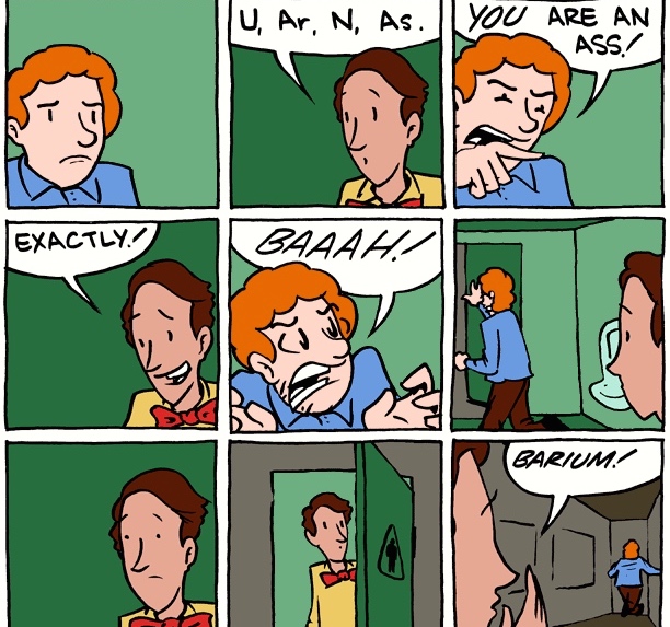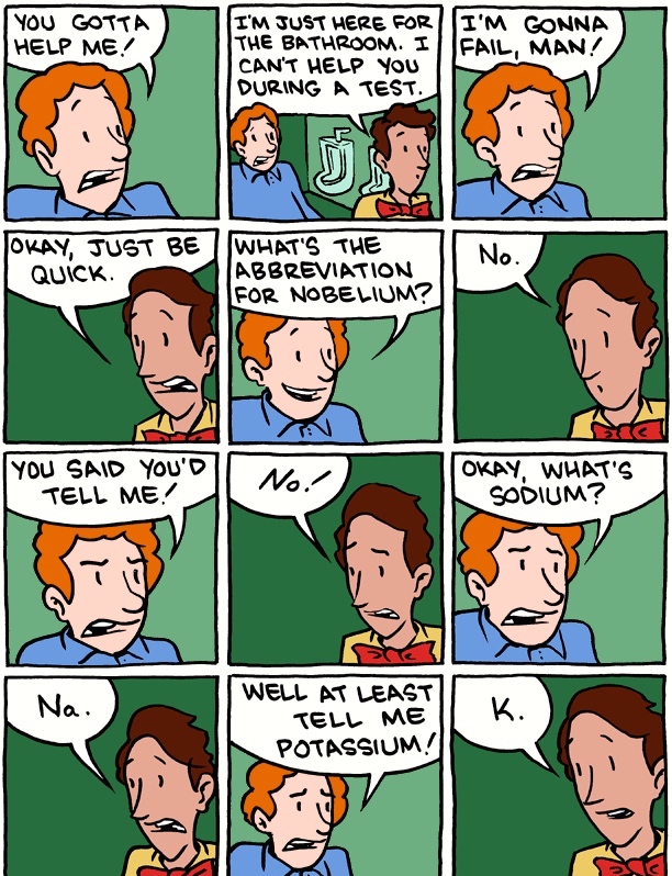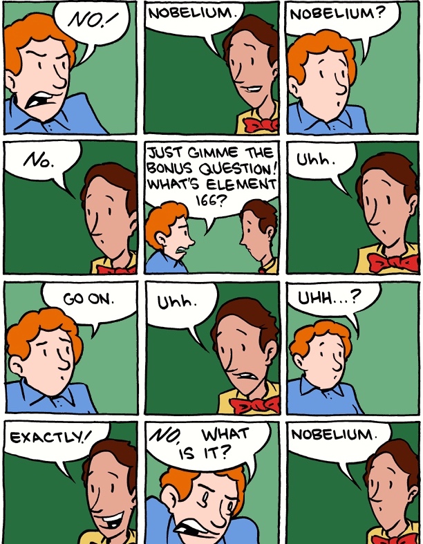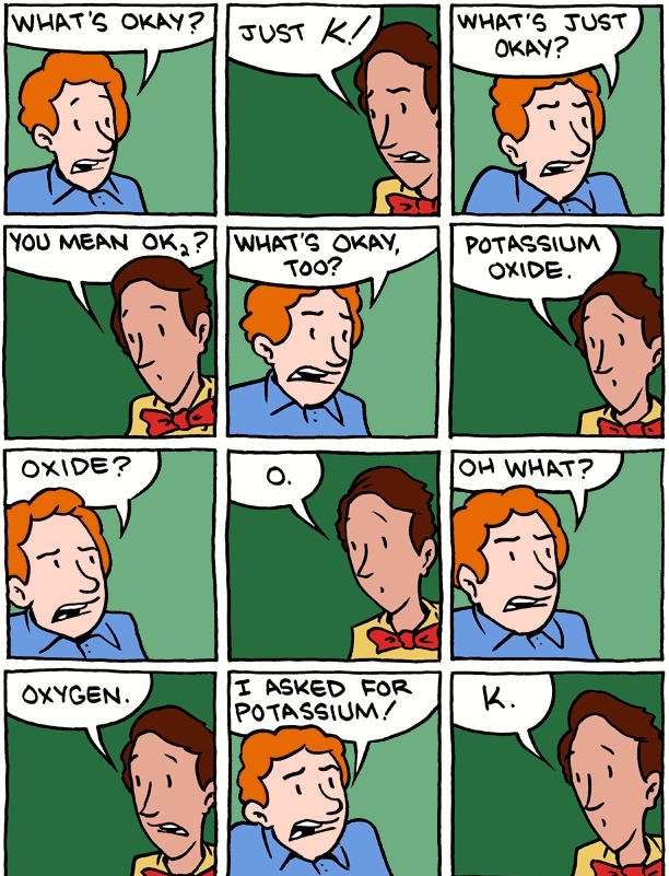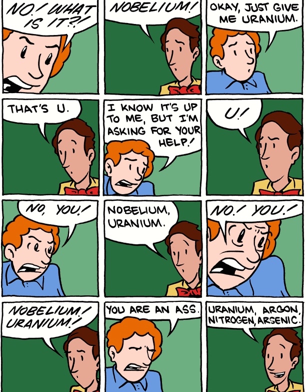 Passed on by Garson O’Toole on ADS-L, a Saturday Morning Breakfast Cereal cartoon from 8/26/11, with a (long and complex) version of Abbott & Costello’s “Who’s on First?” comedy routine that uses the abbreviations for the names of chemical elements in the periodic table (K potassium, Na sodium, No nobelium, etc.): K understood as affirmative ‘kay ‘OK’, Na as negative nah, No as negative no, etc.