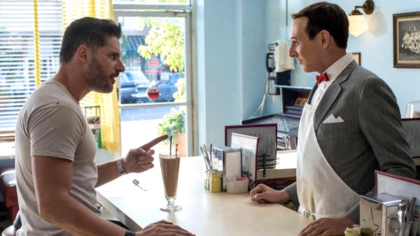 The movie pairs the big (6′ 5″ tall), famously muscular, and intensely masculine actor Joe Manganiello, as himself, with Paul Reubens (at 5′ 10″, and slim, even weedy) in his flamboyantly childlike character Pee-wee Herman, who becomes infatuated with the electrically attractive Manganiello at their first meeting: