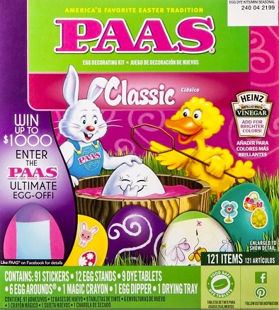 The original Paas Easter egg dye was invented by an American named William Townley. Townley was an owner of a drug store in Newark, New Jersey, where he concocted recipes for home products. In 1893, he figured out how to concentrate dye in tablet form and launched the modern Easter egg dyeing kit. The original price of each tablet was five cents, and customers would make the dye by combining the tablets with water and vinegar. Townley eventually renamed his business the Paas Dye Company. The name Paas comes from “Pasen,” … Dutch … for Easter.