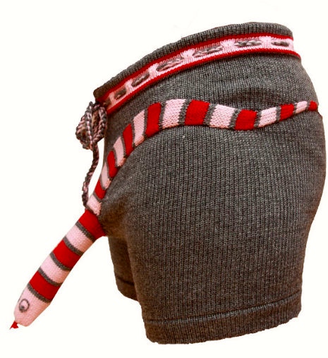 From Aric Olnes, a link to this entertainment on the Dangerous Minds site: “‘Sexy’ Knitted Elephant and Snake Underwear for Men” by Tara McGinley 4/13/16 (intended for a woman to give her man, but of course a man could get (or knit) them for himself or for his guy):