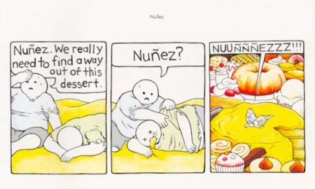 It’s been a long time — about 11 years — since I posted about Nicholas Gurewitch’s comic strip The Perry Bible Fellowship (in 5/17/05, “Ending with a preposition”), and now I come finally to Gurewitch’s big compendium of 2009, Almanack (published in Wilwaukie OR — note the spelling — by Dark Horse Comics).