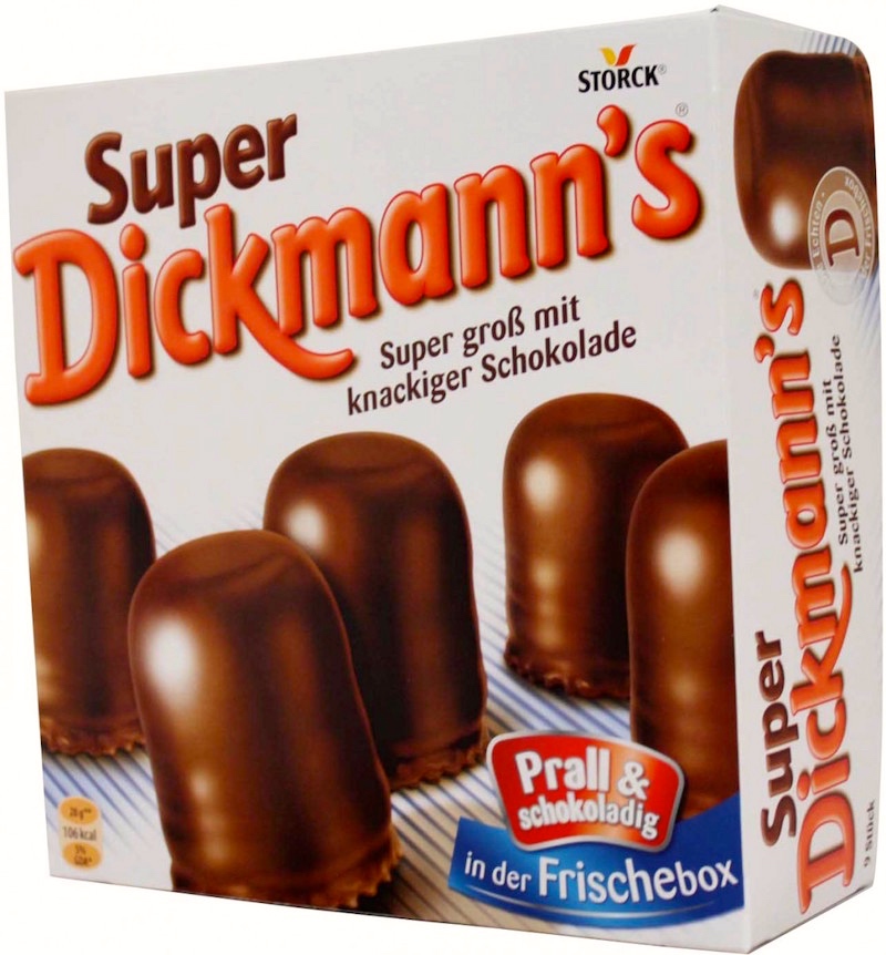 Super Dickmann’s is the name of this particular candy (chocolate covered marshmallow with a soft wafer base), made by the Storck company, which also makes Werther’s Original caramels and hard candies, Haribo bears, and many other candies. Now Dickmann can just be a proper name, but as a common noun it’s a compound literally translatable as ‘big man’ (with dick ‘thick, big, bulky’). I don’t think it’s stretching things to see the candies not just as men, but also as penises. They are prall ‘plump’ and also knackig ‘crispy, crunchy’. Bite them.