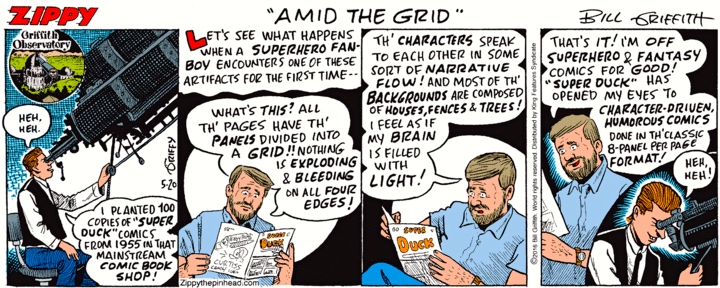 Griffy (from a seat at his telescope in the Griffith Observatory in L.A.) tosses Super Duck at the superhero fanboys, to astound them with the conventions of the classic days.