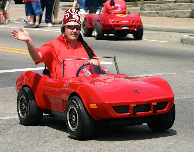 A Pittsburgh Shriner in an iconic miniature car participating in a Memorial Day parade: