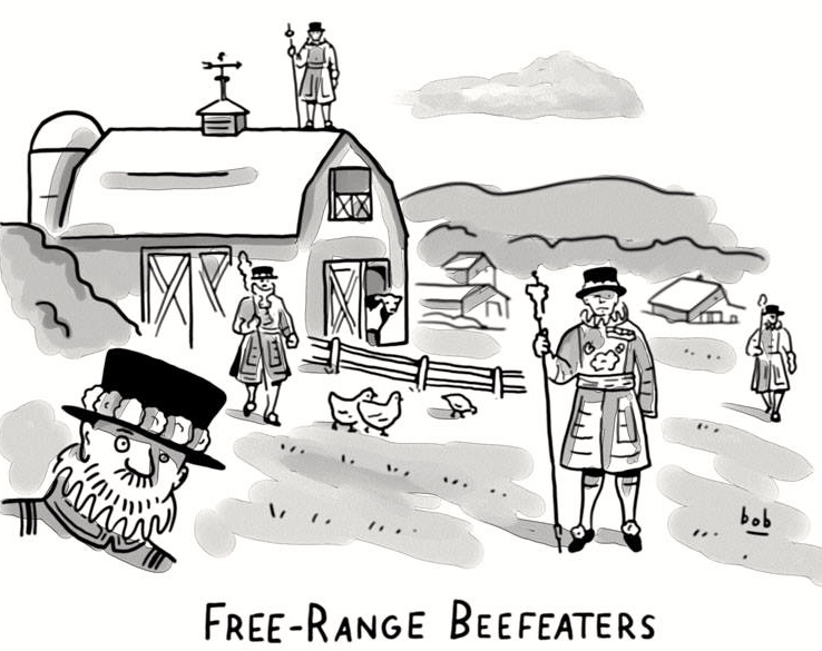 To understand this, you need to know the component expressions — free-range beef and Beefeater — and their referents, and so to recognize that the cartoon shows Beefeaters foraging freely on a farm, a wonderfully absurd idea.