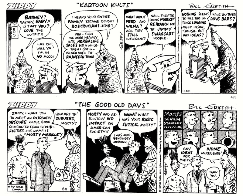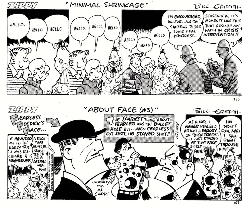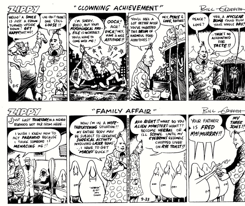 It’s been thirty years since Bill Griffith’s underground comix star Zippy The Pinhead went above ground and joined King Features Syndicate. Zippy had been around since 1971, so he’s in the midst of a forty-fifth anniversary, too.