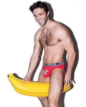 White brief [#2 is the red version] with navy back panels, featuring boosting pouch and star print to attract attention, just where you want it.