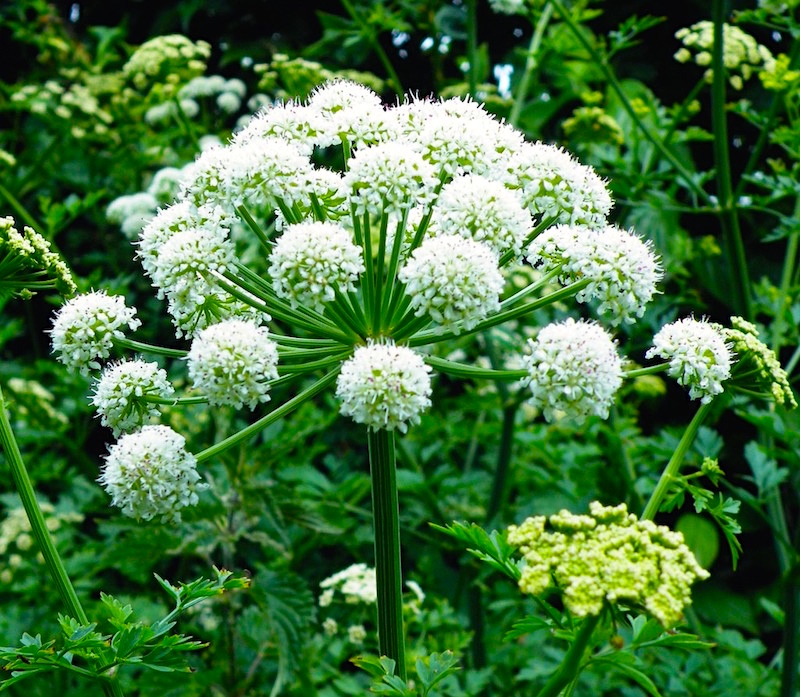 Angelica [wild celery] is a genus of about 60 species of tall biennial and perennial herbs in the family Apiaceae [umbellifers], native to temperate and subarctic regions of the Northern Hemisphere, reaching as far north as Iceland and Lapland and Greenland. They grow to 1–3 m (3 ft 3 in–9 ft 10 in) tall, with large bipinnate leaves and large compound umbels of white or greenish-white flowers.