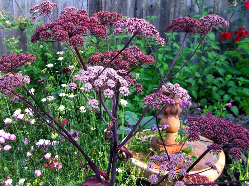White. Coming across a plant labeled Angelica, I of course thought of the familiar white-flowered umbellifer.