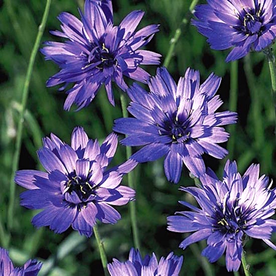 The showy violet-blue perennial flower of the aster family Catananche caerulea bears the common names Cupid’s dart, blue cupidone, and cerverina. It is a garden flower and is often used in dried flower arrangements. The plant grows in clumps of narrow grey-green leaves, and later in the summer sends up long stems at the end of which bloom bright cornflower blue to lavender flowers with rectangular, fringed petals and deep purple centers. The closed buds are soft and silver and the bracts form a papery cup beneath the opened blossom.