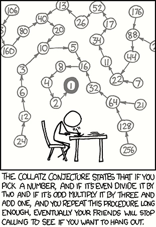 Every so often, things coincide. In the last couple of days, Jeff Shaumeyer relayed on Facebook an 8/9 posting on Jason Kottke’s blog with a delightful video about the Collatz Conjecture, and then a day later I got a phone call from Greg Huber at UC Santa Barbara about this very same conjecture in number theory and its possible connection to a paper Steve Isard and I wrote 46 years ago (in previous lives) on “one-symbol Smullyan systems”. And there’s an xkcd: